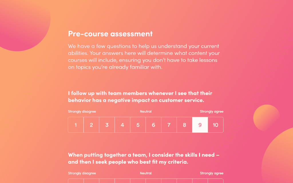 A pre-course assessment will help direct your users to the right course based on their skills or needs. With a pre-course assessment, you can ascertain your users’ skill level and get them enrolled on the right courses for them. This leads to increased engagement with learning materials and streamlines the learning journey.