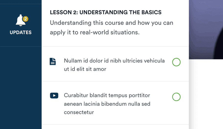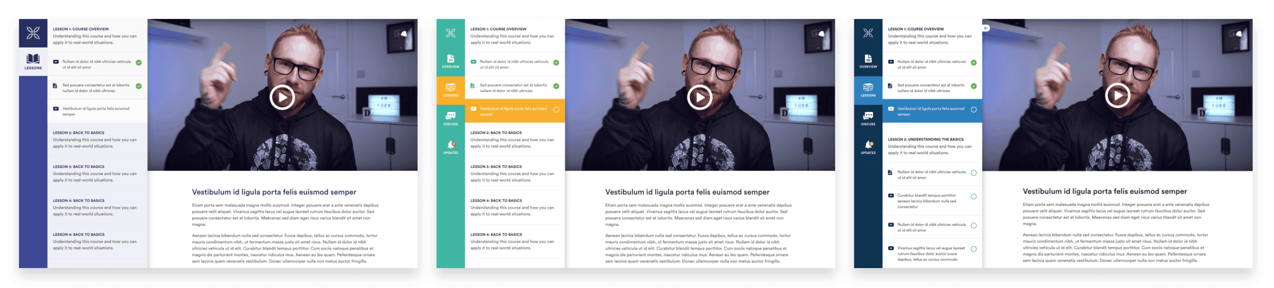 On the left, we have two layers of navigation. The left-most navy bar allows a user to navigate between different functions of the learning management system, such as lessons or discussions (which might be a forum). The white pane that follows allows users to navigate sections within that parent. If “lessons” is selected, then the white pane will display lessons within that course. And if discussions is selected, then it could show a list of conversations happening on the forum of this particular course.
