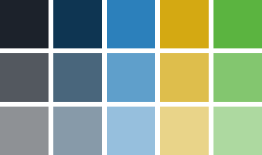 I finally settled on the blues of the third design with fairly neutral colours that would fit within business and educational environments, without detracting from the content. I needed a couple of additional accent colours; the green to indicate course progression (see the green ticks next to completed lessons) and the gold to bring attention to notifications. I then duplicated the colours with variations of opacity (75 and 50%) for secondary or tertiary information.