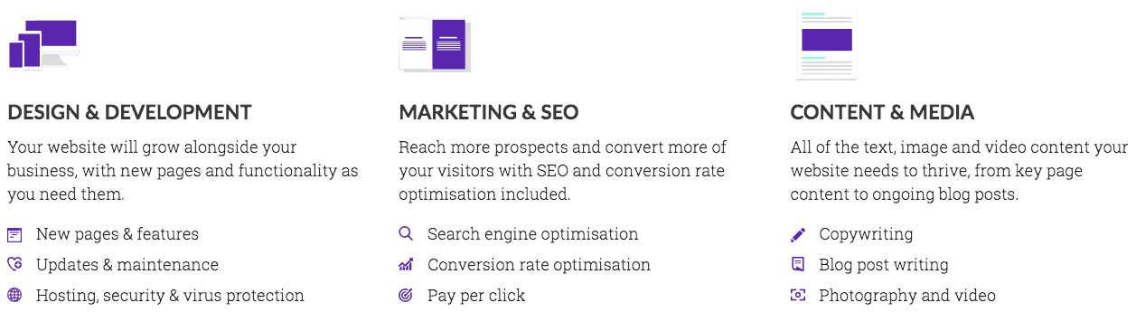 Most sites use icons to help explain some of the features or services on offer. You've likely seen these on our What We Do page. Aside from being nice to look at, they help explain the feature or service. Used right, icons can negate the need to read the accompanying text, great for the lazy time conscious user.