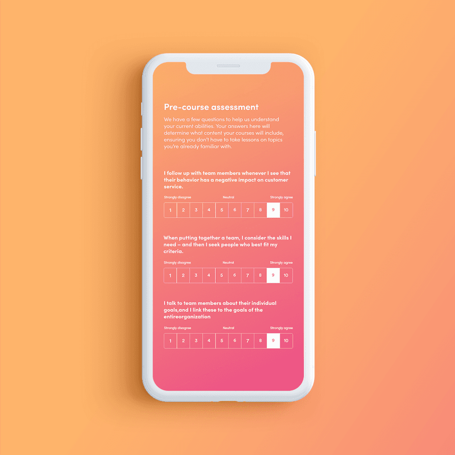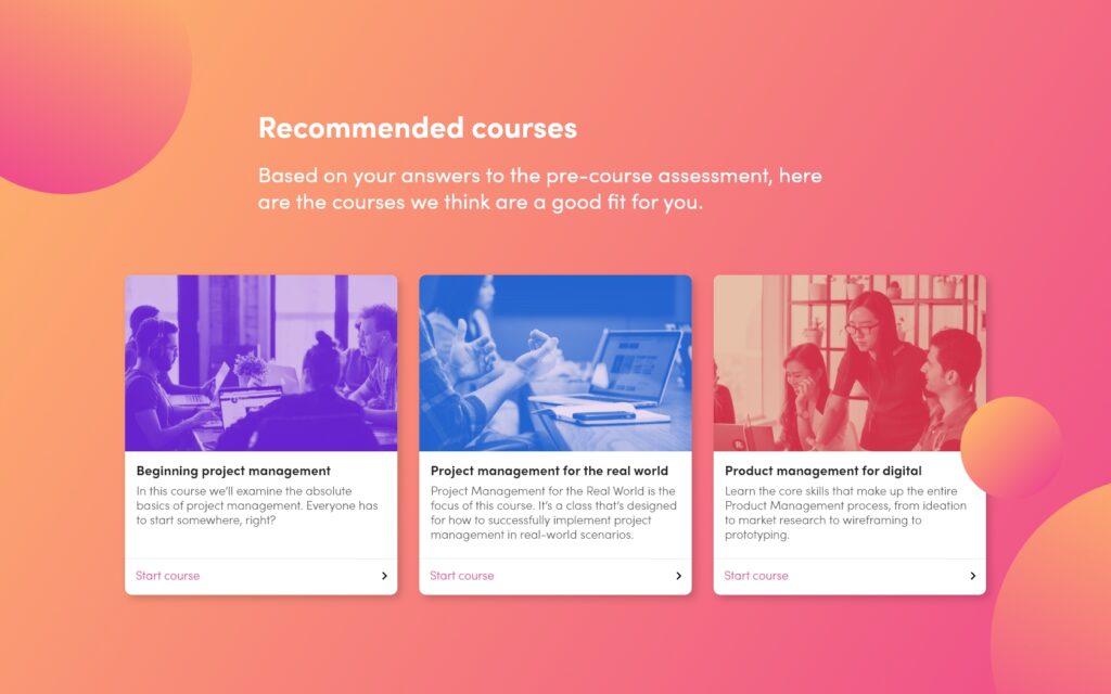 A pre-course assessment will help direct your users to the right course based on their skills or needs. With a pre-course assessment, you can ascertain your users’ skill level and get them enrolled on the right courses for them. This leads to increased engagement with learning materials and streamlines the learning journey.