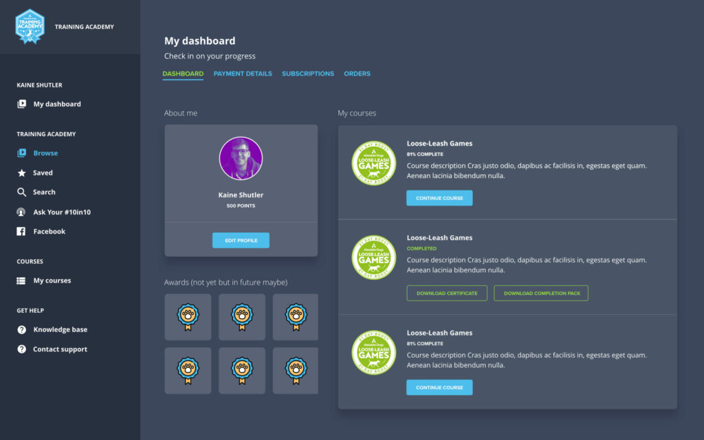 As we mentioned, most systems will have a dashboard of some kind, but what if you need to incorporate more information? Although not standard,, we can absolutely do that as part of a custom build! Our client, Absolute Dogs, has a video library of training videos, online courses, subscriptions and an affiliate program all which needed to be accessible from one location: the dashboard. We created an easily navigable dashboard that acted like a hub for the user to access every part of Absolute Dogs diverse offering.
