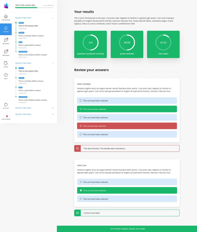 Out of the box, off-the-shelf systems and open-source frameworks like LearnDash look pretty basic and, errrrrrr, ugly. Off-the-shelf systems don’t let you customise much else beyond the colours and branding, but thanks to our specialist design and development team we can mock up a total custom design that is consistent throughout your system regardless of whether it’s an out of the box feature, custom feature or plugin.